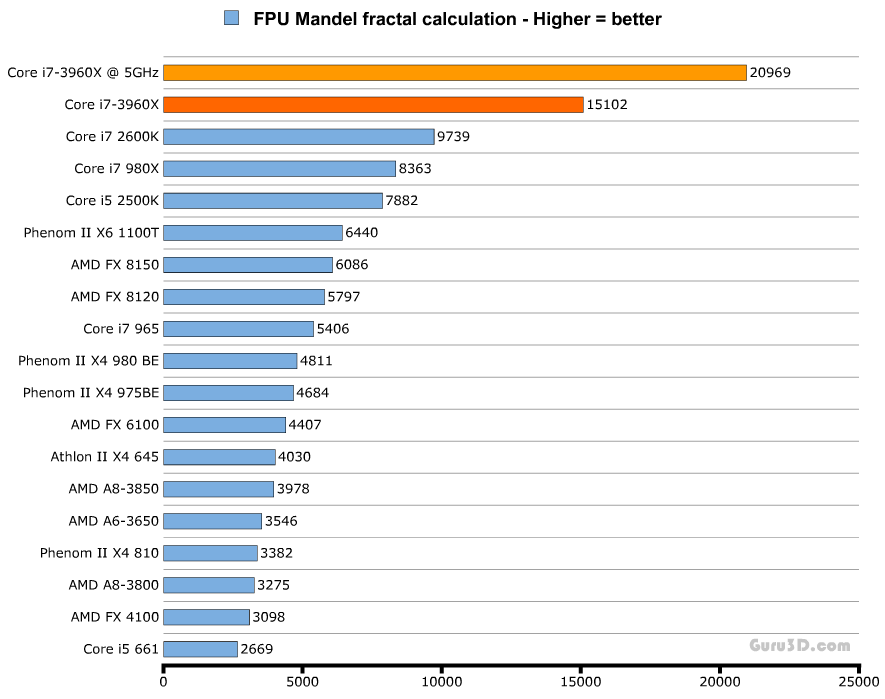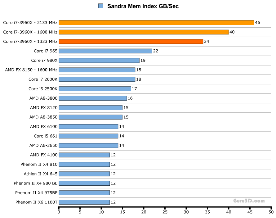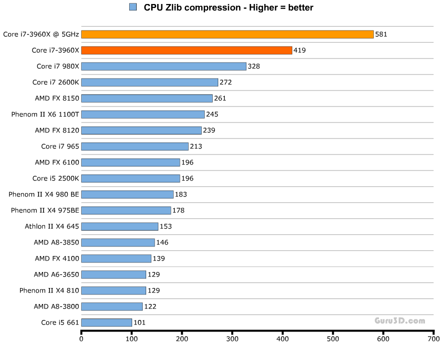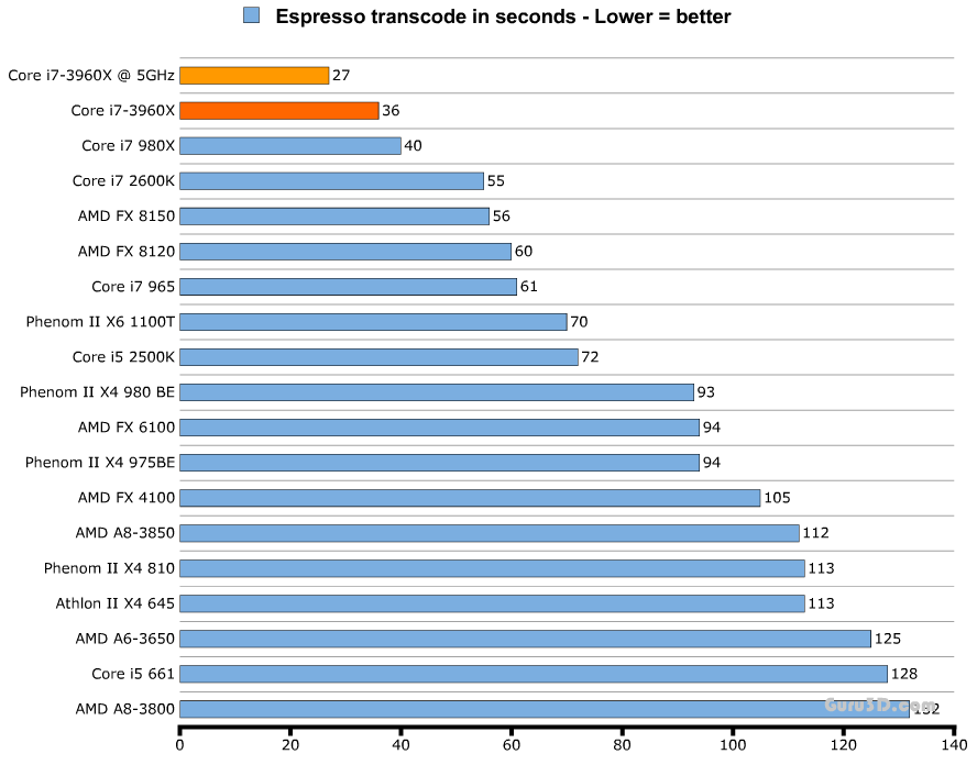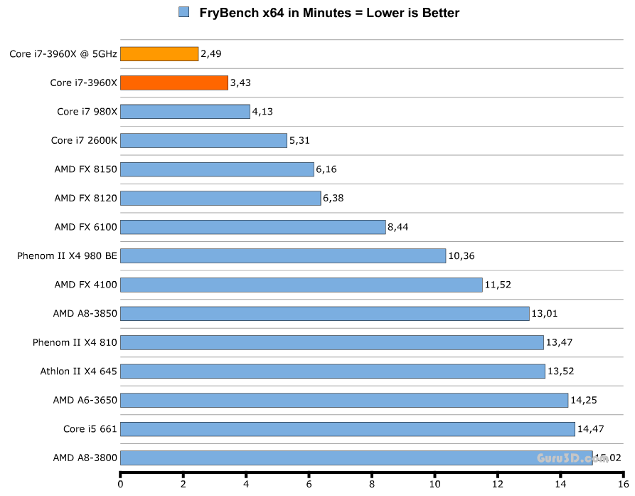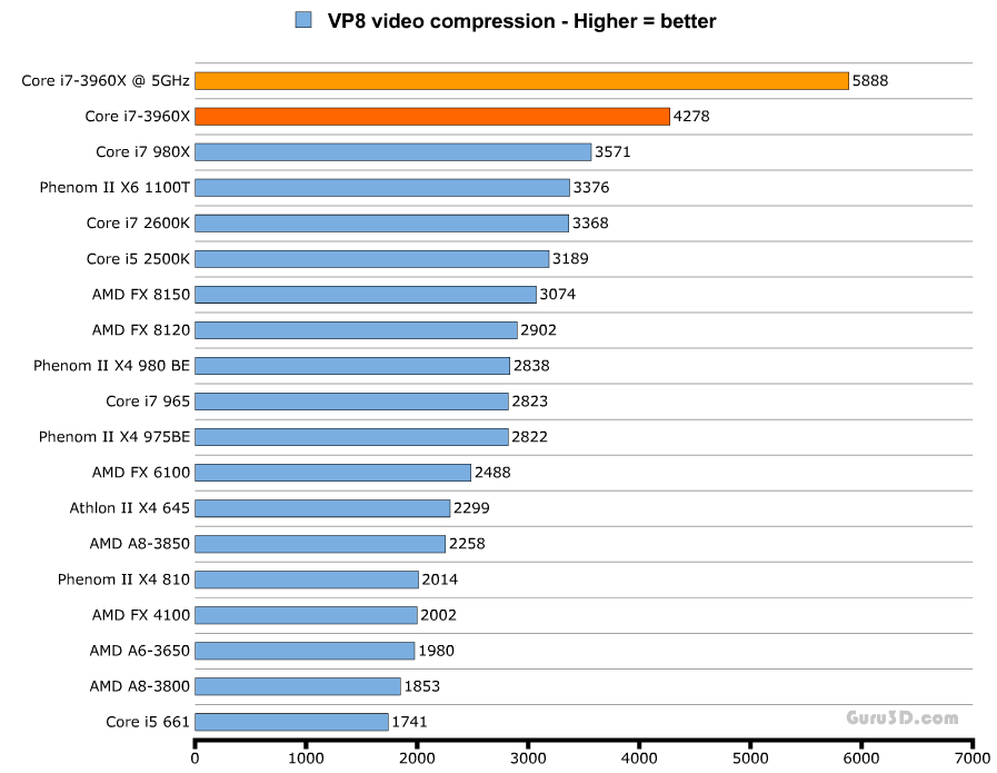 Комментариев к тестам я не привожу, однако стоит отметить, что на графиках даны результаты выступления процессора Core i7-3960X как в номинальном режиме работы (тёмно-оранжевая линия), так и в разгоне (светло-оранжевая).