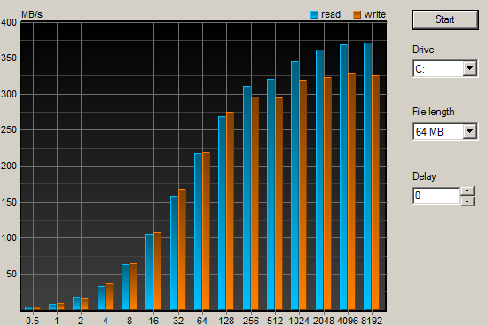 Для тестов использовался твердотельный накопитель A-DATA N002, что оборудован и портом USB 3.0 и SATA 6Гб/с. График, расположенный выше, показывает скорость чтения с устройства по USB 3.0.