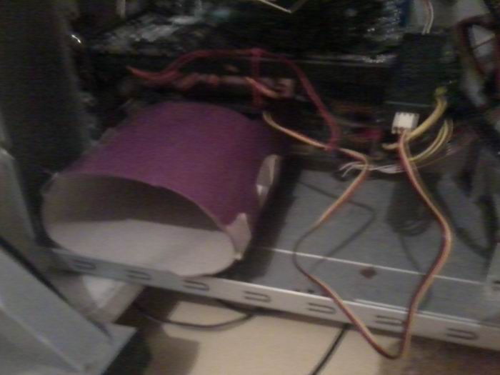 4) Сооружаем из картона Воздуховод. Воздуховод необходим такой конструкции для того чтобы карта не утонула в собственном горячем воздухе. Охлаждать радиатор 29 градусным воздухом нежели 45ти(измерено опытным путём при отсутствие воздуховода) градусным. Даже товарищам с корпусами в конструкции боковых крышек которых напротив видеокарт установлены вентиляторы я советую всё равно лепить воздуховоды, т. к. в таком случае вам можно будет снижать обороты вентилятора установленного на карту, и иметь куда меньше шума.