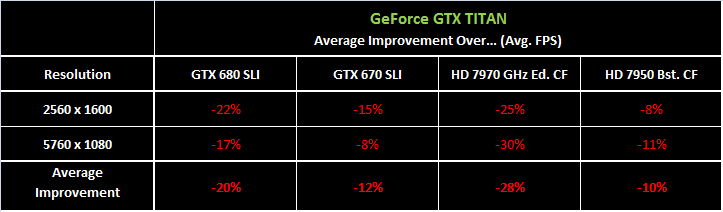 Табличка выше показывает, на сколько процентов в каком разрешении GTX Titan отстаёт от тех или иных SLI/Crossfire тандемов.
