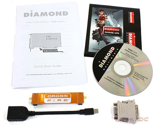 Оформление диска чрезвычайно напоминает оное у продуктов Diamond образца 1998 года, видать фирменный стиль такой. В коробке, помимо видеокарты, пользователь найдёт мостик CrossFire, два конвертера видеосигнала, инструкцию и тот самый диск с драйверами.