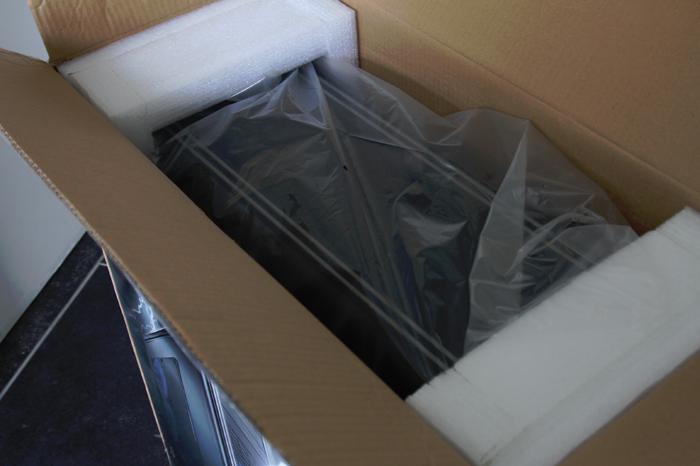 Коробка картонная, внутри неё можно найти сам корпус, зажатый с двух сторон в держатели из пенистого материала.