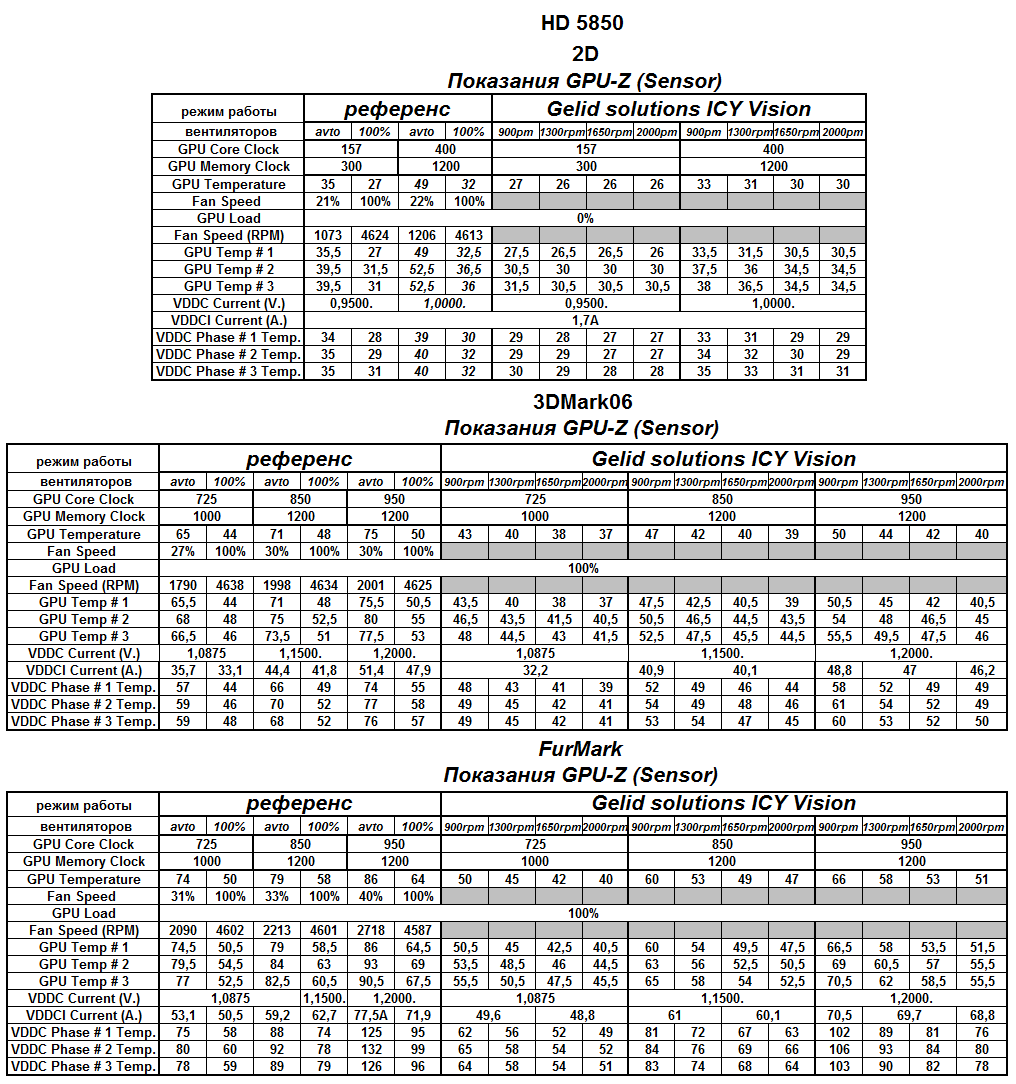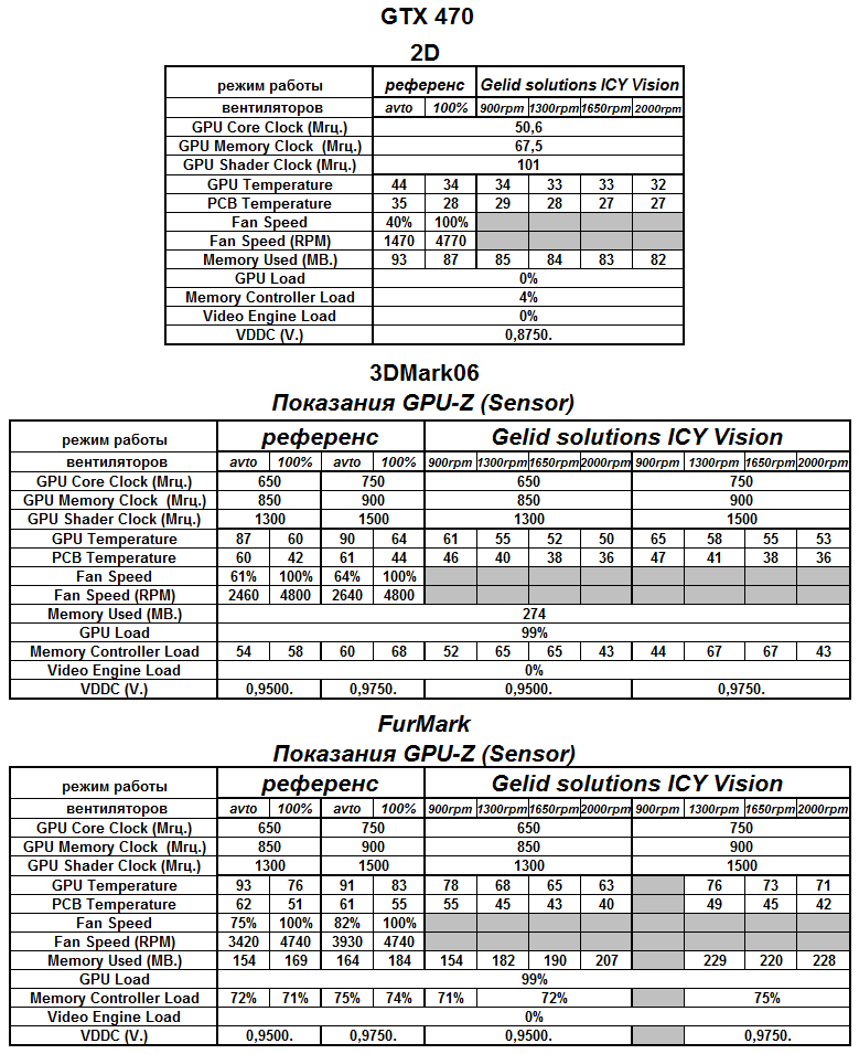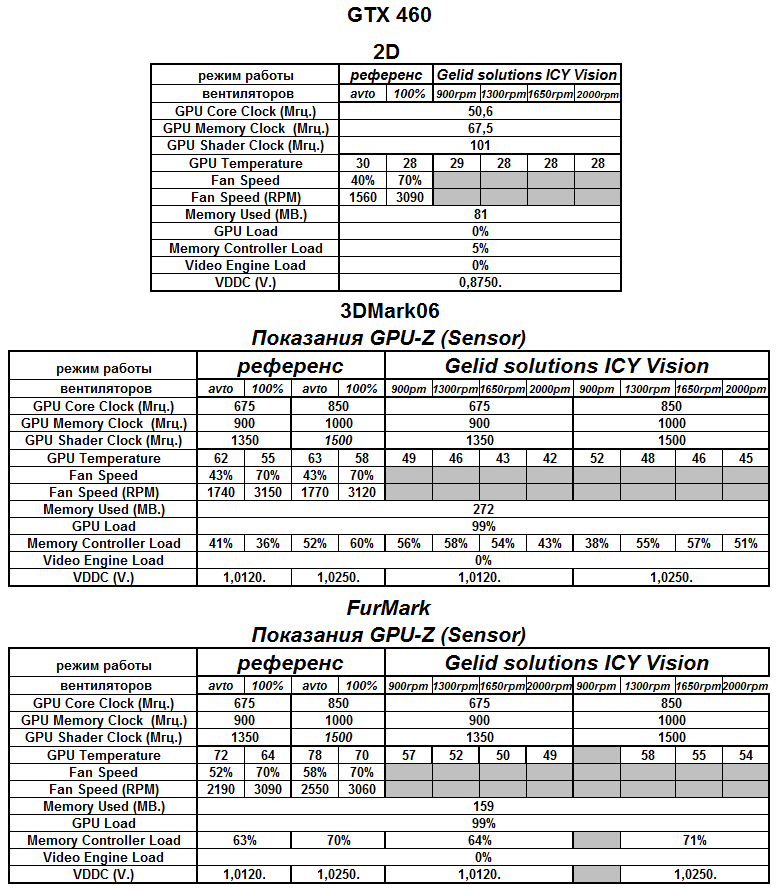 Для более детального ознакомления с работой видеокарт при тестировании данного VGA-кулера, к вашему вниманию следующие таблички: