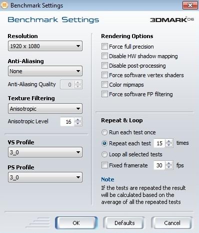 Тестирование происходило в 3DMark06 вот с такими параметрами: