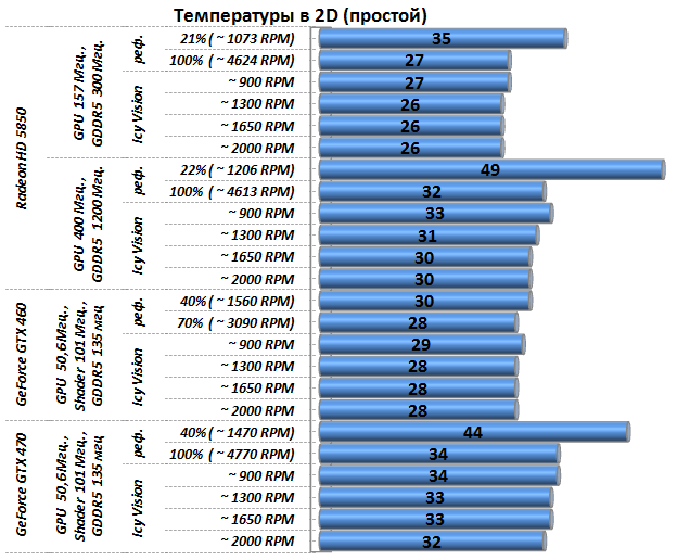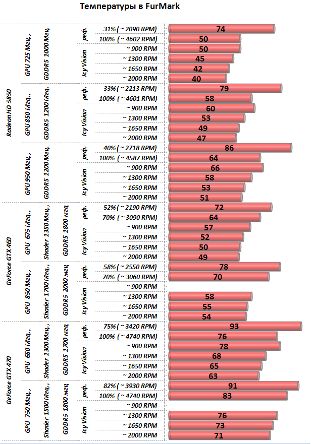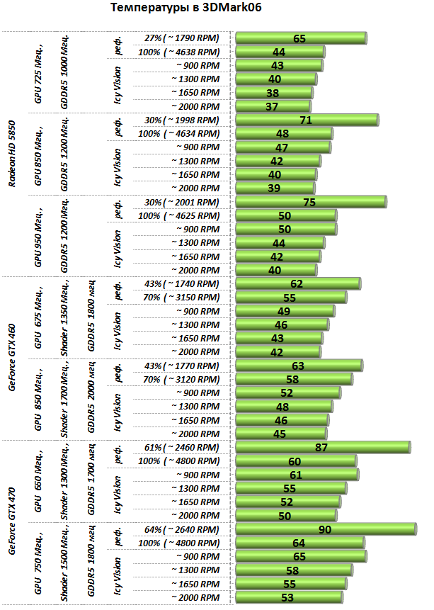 Как можно увидеть из общих графиков трёх протестированных карт, самый «горячий» нрав у GTX 470 (впрочем, этот самый "нрав" был успешно «укрощён» использованной в тестах СО). Что касается GTX 460 и HD 5850, при использовании VGA-кулера наблюдается паритет. Правда, нужно учитывать, что на 5850 «разгон» был по тактовым частотам выше, чем на 460-ой. Конечно, дискуссию по поводу отличий карточек и всего остального можно развести до бесконечности, да и сравнивать одно с другим будет не совсем правильно. Искренне надеюсь, что вы меня поняли, уважаемые читатели!