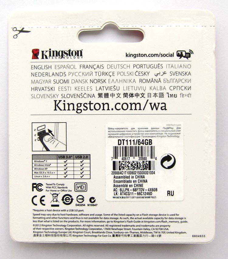 Фронтальная часть блистера даёт нам понять, что ёмкость новинки составляет 64ГБ, а подключение осуществляется по USB 3.0, гарантию на свой продукт Kingston даёт пять лет.
