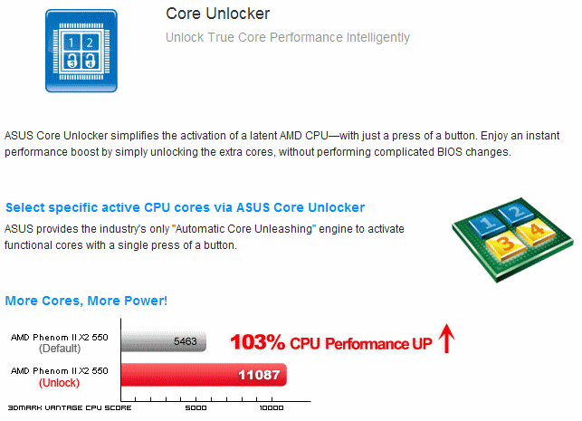 Core Unlocker — разблокировка латентных ядер процессора, если они физически присутствуют, при помощи кнопки. Как сказано, вместо сложного изменения через BIOS. Сразу почему-то вспоминается шутка про рекламу зубных щеток : «у меня нет зубов в труднодоступных местах».