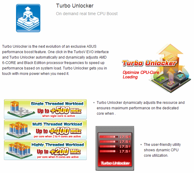 Turbo Unlocker — включение автоматического динамического повышения тактовой частоты ядер процессора, в зависимости от нагрузки и числа активных ядер, это делается через другое инновационное решение ASUS, программную оболочку “Ultimate O.C. Processor” TurboV EVO.