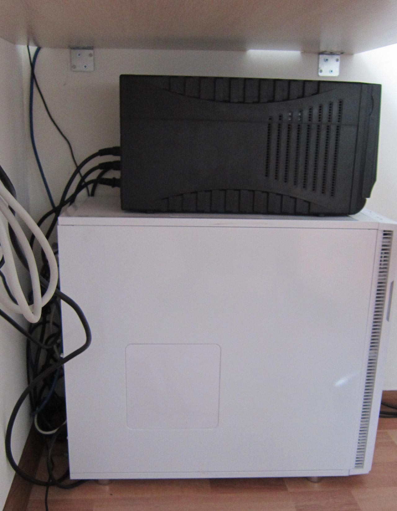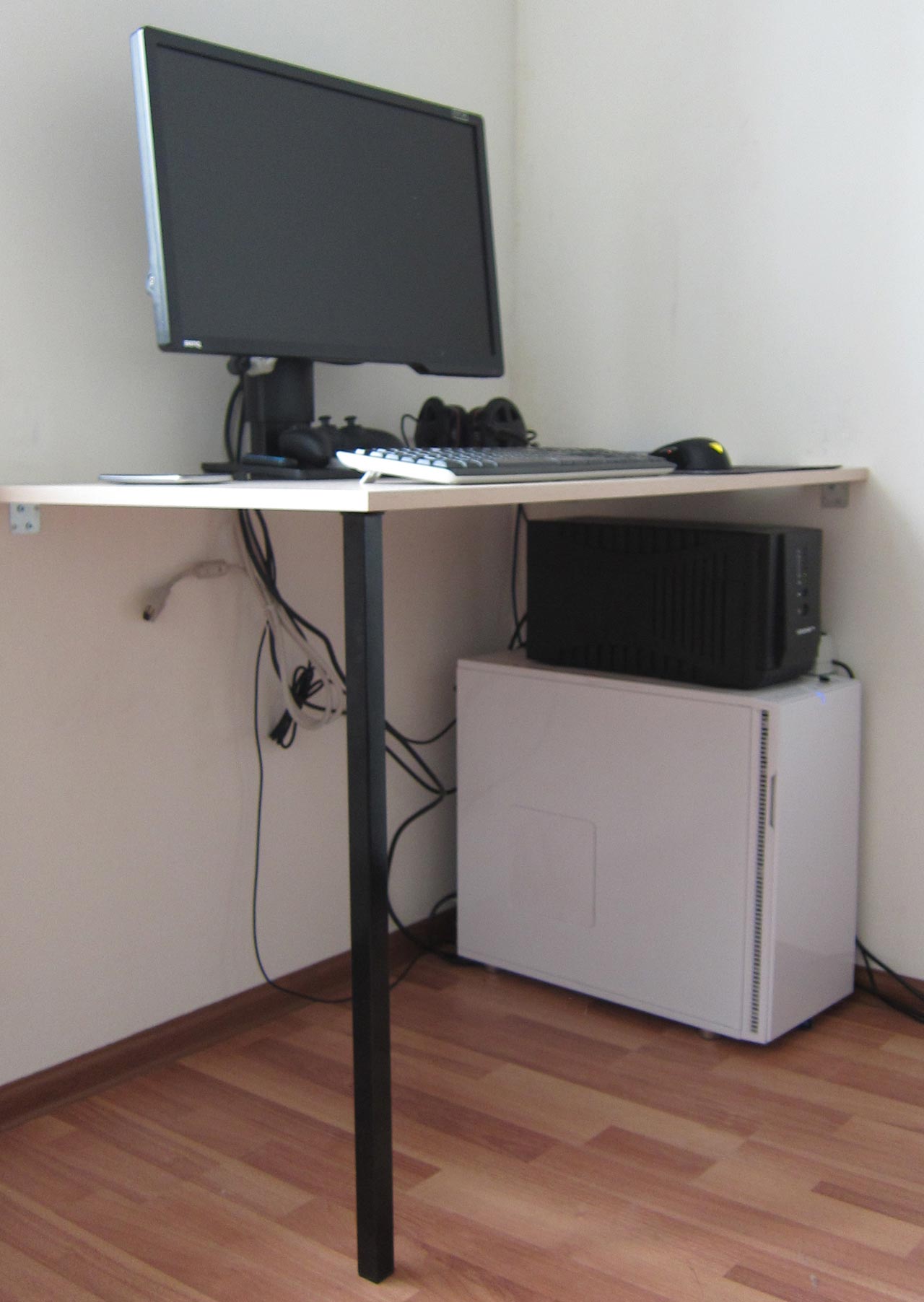 Итог таков - при минимуме умений и возможностей, в том числе материальных, удалось собрать два полноценных угловых компьютерных стола суммарно за ~1000 рублей. Столы удобны в использовании, дают простор для деятельности (имеют большую поверхность, на которую помещается много вещей), приятно выглядят (богатство выбора мебельных щитов даёт возможность подобрать цвет под многие варианты интерьера), легко обслуживаются и при необходимости демонтируются, предоставляют крайне полезную возможность прятать все кабели под собой и копаться внутри ПК, никуда его не выдвигая и не от чего не отключая. Мы сооружениями очень довольны и с удобством проводим за ними время, сейчас мне мой старый компьютерный стол вспоминается как нечто ужасное, сравни средневековью в его худших проявлениях
