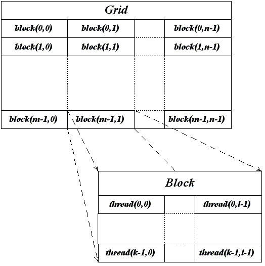 Block – содержит в себе множество потоков (thread). Потоки разных блоков между собой взаимодействовать не могут. Для чего нужно было вводить блоки? Каждый блок по сути отвечает за свою подзадачу. Например, большое изображение (которое является матрицей) можно разбить на несколько более мелких частей (матриц) и параллельно работать с каждой частью изображения.