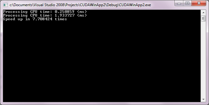 Для наглядности была написана небольшая консольная (для минимизации кода) программа, производящая операции с двумя массивами типа float, т.е. с нецелочисленными значениями. По указанным выше причинам инициализация (заполнение массива различными произвольными значениями) производилось силами CPU. Далее с соответствующими элементами из каждого массива производилось 25 всевозможных операций, промежуточные результаты записывались в третий массив. Менялся размер массива, результаты следующие: