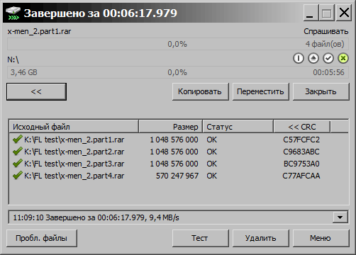 Первым на очереди идёт самый простой для любой флешки тест - копирование нескольких объёмных файлов. Для этих целей я использовал многотомный RAR архив с фильмом "Люди Икс 2" (720p) внутри, всего получилось 4 файла, общий вес - 3.45 ГБ (3 715 975 967 байт). Копирование происходило с SSD на флешку посредством программы TeraCopy, которая после копирования выдаёт общее время, затраченное на операцию, а также среднюю скорость передачи данных.