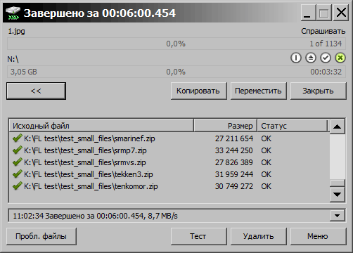 Второй тест, проведённый с помощью этой софтины - копирование с SSD большого количества файлов небольшого размера, общим объёмом 3.04 ГБ (3 271 653 179 байт). Подробнее о файлах: 663 JPG файла (329 МБ (345 828 725 байт)), 411 MP3 файлов (1,02 ГБ (1 104 164 810 байт)), да 60 архивов ZIP (1,69 ГБ (1 821 659 644 байт)).