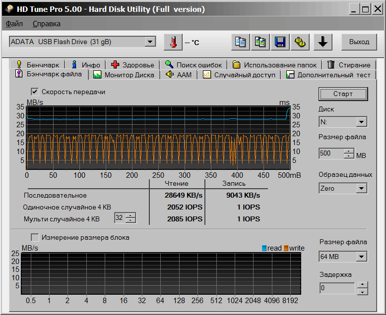 | ADATA DashDrive Choice UC500 | 19.1МБ/с | 7680КБ/с | 0.585мс | 1 |
