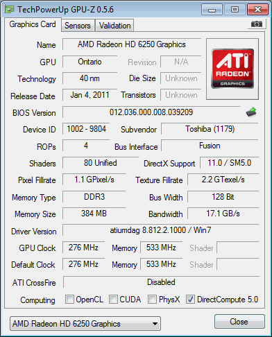 - Графика – AMD/ATI 6250 384 up to 949 МБ (1024x600)