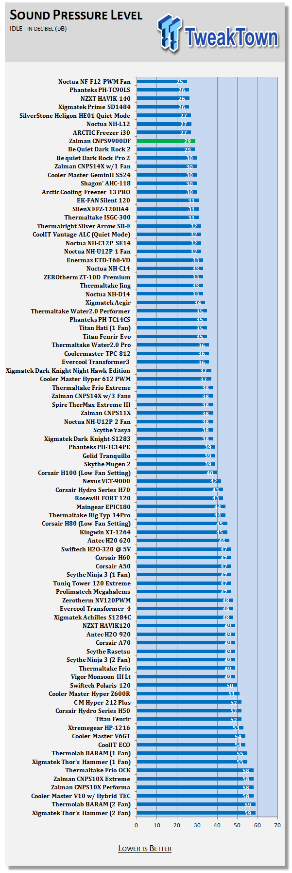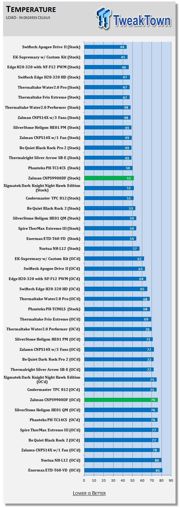 Тесты показали, что дела у CNPS9900DF идут не лучшим образом - результаты приемлемые, но многие кулеры "двухбашенного" типа выступили лучше продукта Zalman.