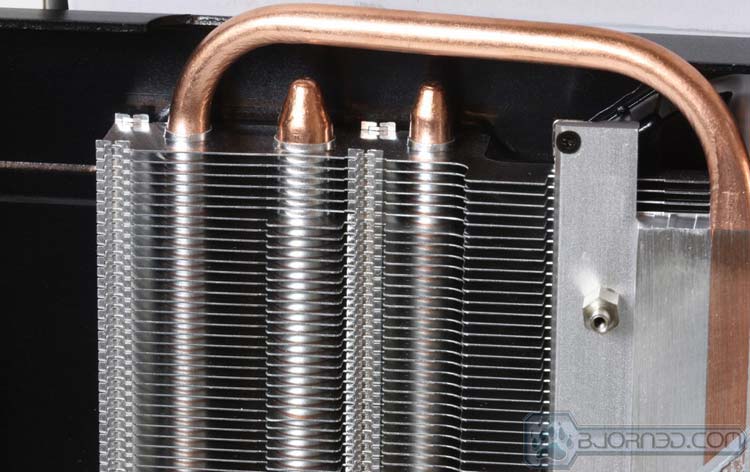 Медные теплотрубки проходят сквозь алюминиевые пластины радиатора. Основание кулера называется ровным и плоским.