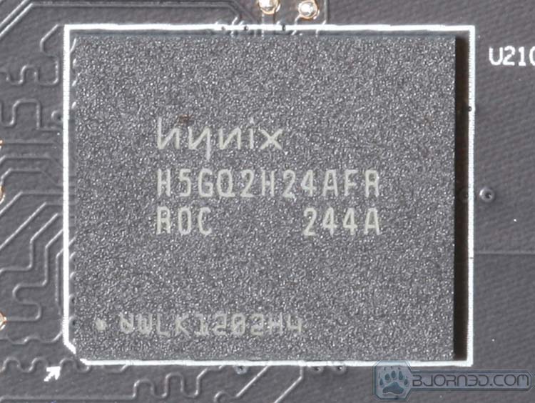 На фотографии выше показан чип памяти, он произведён Hynix, рассчитан на рабочие частоты вплоть до 6ГГц.