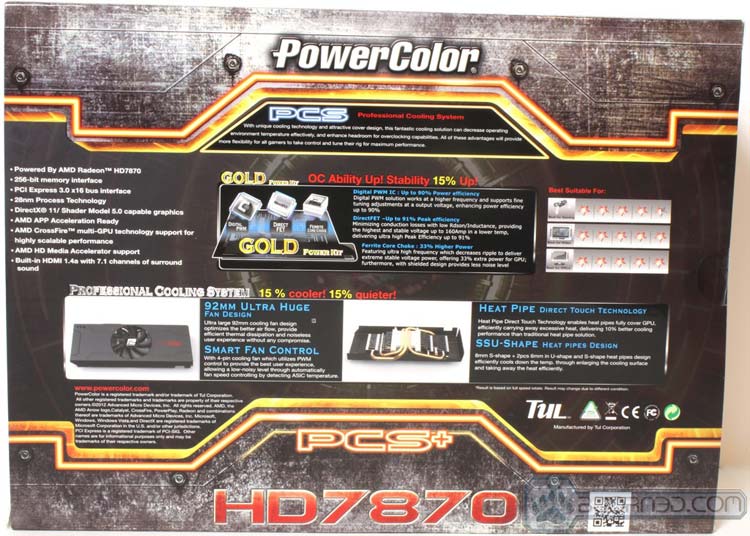 Видно, что изделие совместимо с Windows 8, имеет UEFI Vbios. Однако нигде на упаковке нет указания того, что покупатель приобретает изделие на базе Tahiti LE, а не Pitcairn, вероятно PowerColor считает, что обыватели таких слов даже не слышали и знать о типе графического ядра им ни к чему.