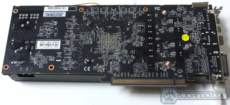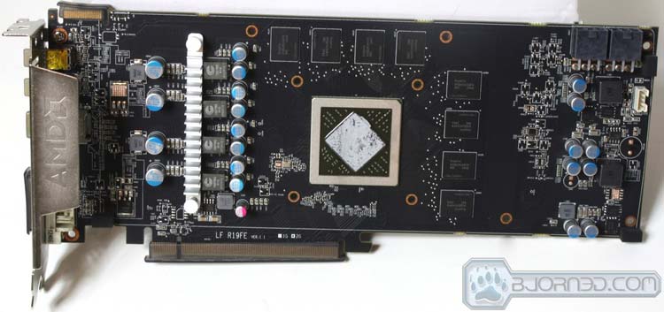 PowerColor идёт по проторенной дорожке, дизайн системы охлаждения видеокарты вполне стандартен - вентилятор находится посередине пластикового кожуха кулера. Горячий воздух выбрасывается из корпуса, хоть и не весь. PCIe и CrossFire коннекторы, а также видеовыходы закрыты полупрозрачными пластиковыми крышками, какая трогательная забота о пользователе