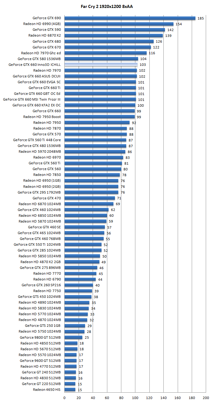 Далее нам покажут достижения разогнанной Inno3D iChill HerculeZ GeForce GTX 660 в некоторых приложениях. Традиционно, тест проводится в следующих играх/бенчмарках: Crysis 2, 3DMark 11 и Aliens vs Predator. Смотрим результаты: