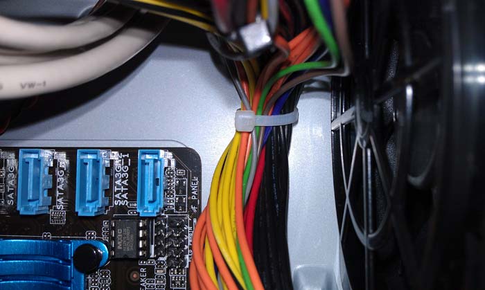 Неприятным сюрпризом оказалась вот эта стяжка, удерживающая в куче провода от БП. «Благодаря» ей кабель питания самой платы не дотягивался до соответствующего разъёма. Благо связка проводов не была намертво присобачена к плате и капитулировала без особых хлопот.