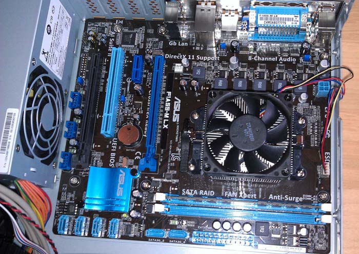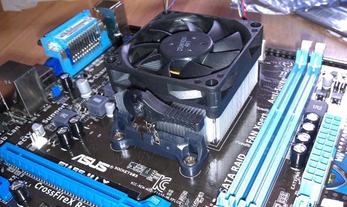 Приступив к сборке, я вдруг вспомнил, что не собирал компы аж с 2006 года :))) Т.к. на боксовый кулер уже нанесена термопаста, проблем с его установкой не возникло. Тем более, его нужно было лишь закрепить на пластиковые держатели, присутствующие на самой "мамке".