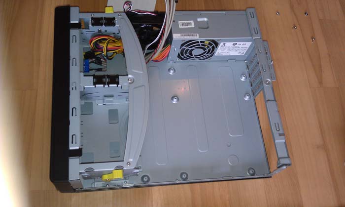 В корпусе имеются специальные рычажки жёлтого цвета, которые служат для отсоединения передней панели и облегчения процесса установки жёсткого диска и привода.