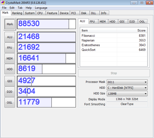 А вот предпочитаемый мной КристалМарк. Результаты, относительно других АМД, весьма не плохи, особенно если принимать во внимание стоимость процессора и тот факт, что не установлено никакой "дискретки".