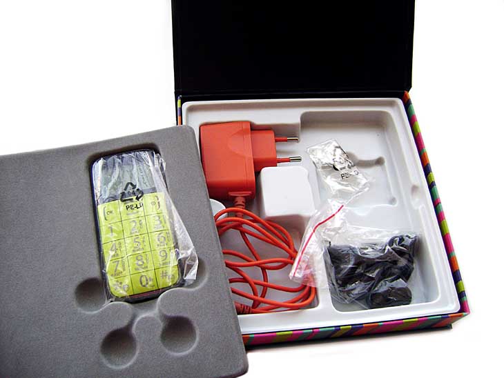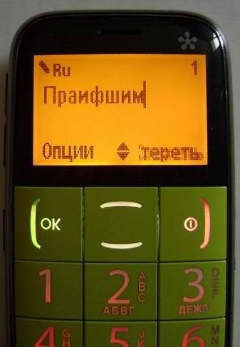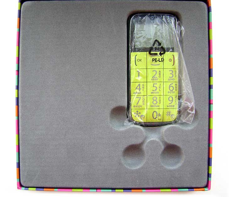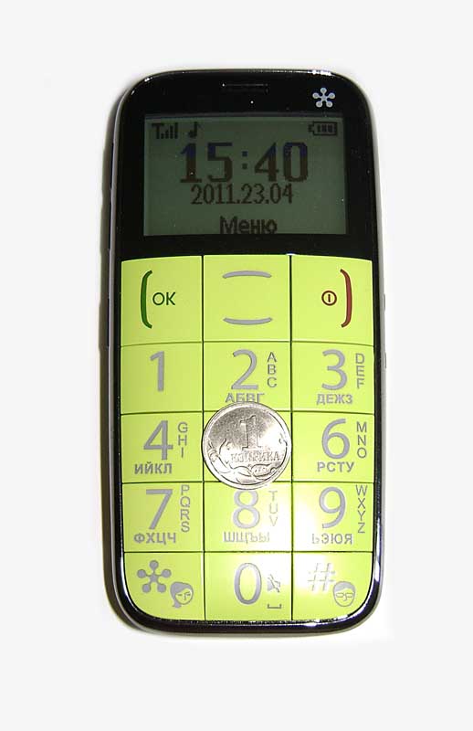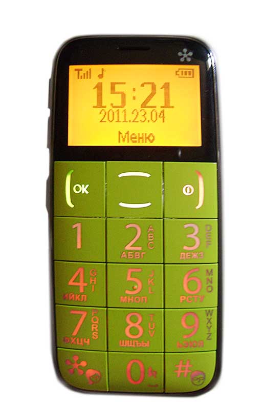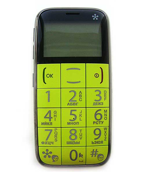 Внешность сотового телефона необычна, но смутно знакома. Если убрать кислотно-зелёный цвет корпуса и большие кнопки, мы получим нечто классическое образца 2003 года ![]()