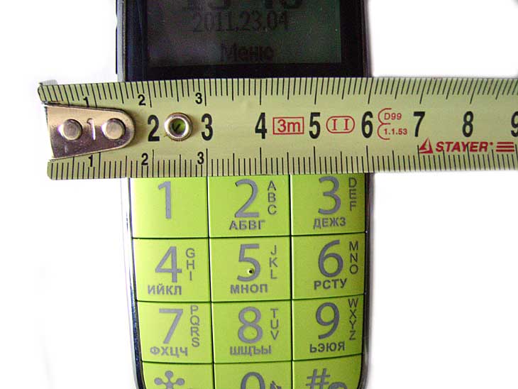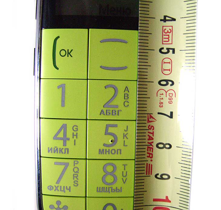 Забавы ради (ну и ради проверки заявленных производителем габаритов), мы решили измерить кнопки телефона с помощью хитрого девайса, в народе именуемого "метр" или же "рулетка":