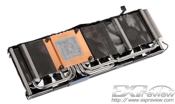 Основание медное, радиатор алюминиевый, количество шарикоподшипниковых 92мм вентиляторов - три штуки, количество 6мм теплотрубок - пять штук. Кулер способен справиться с охлаждением видеокарты с TDP, равным 275 ваттам.