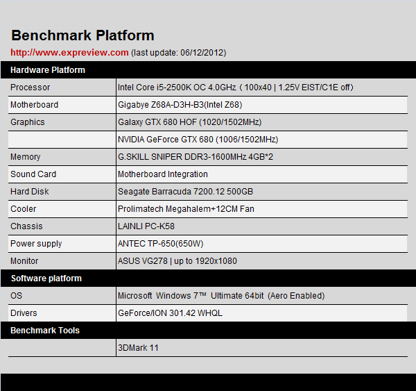 Как видно, тестирование изделия нельзя будет назвать полноценным, т.к. из тестов значится один лишь 3DMark 11.