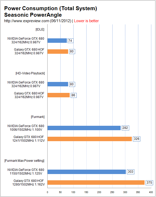 Сверху вниз идут показатели потребления системы целиком во время следующих действий: простой, воспроизведения HD видео, FurMark, FurMark в самом жёстком режиме. Сравнение идёт с референсной картой в разгоне.