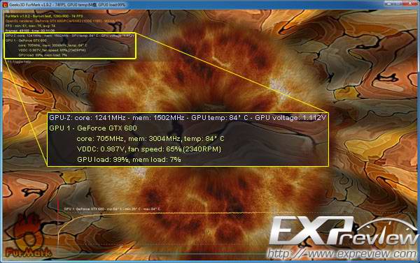 После 10 минут в FurMark, карта разогрелась до 84 градусов, частота была в районе 1241МГц при напряжении 1.112 вольт, вентилятор крутился на 2300 об/мин, его было очень хорошо слышно. В обычной игровой нагрузке скорость вентиляторов должна быть в районе 1400-1600 об/мин, что вполне тихо.