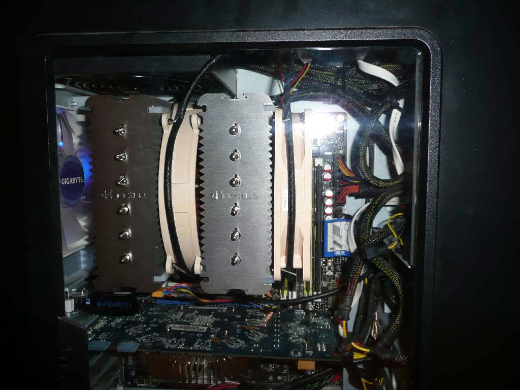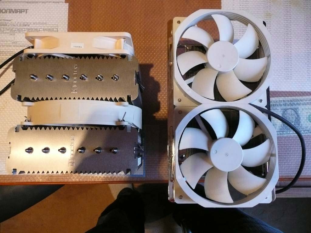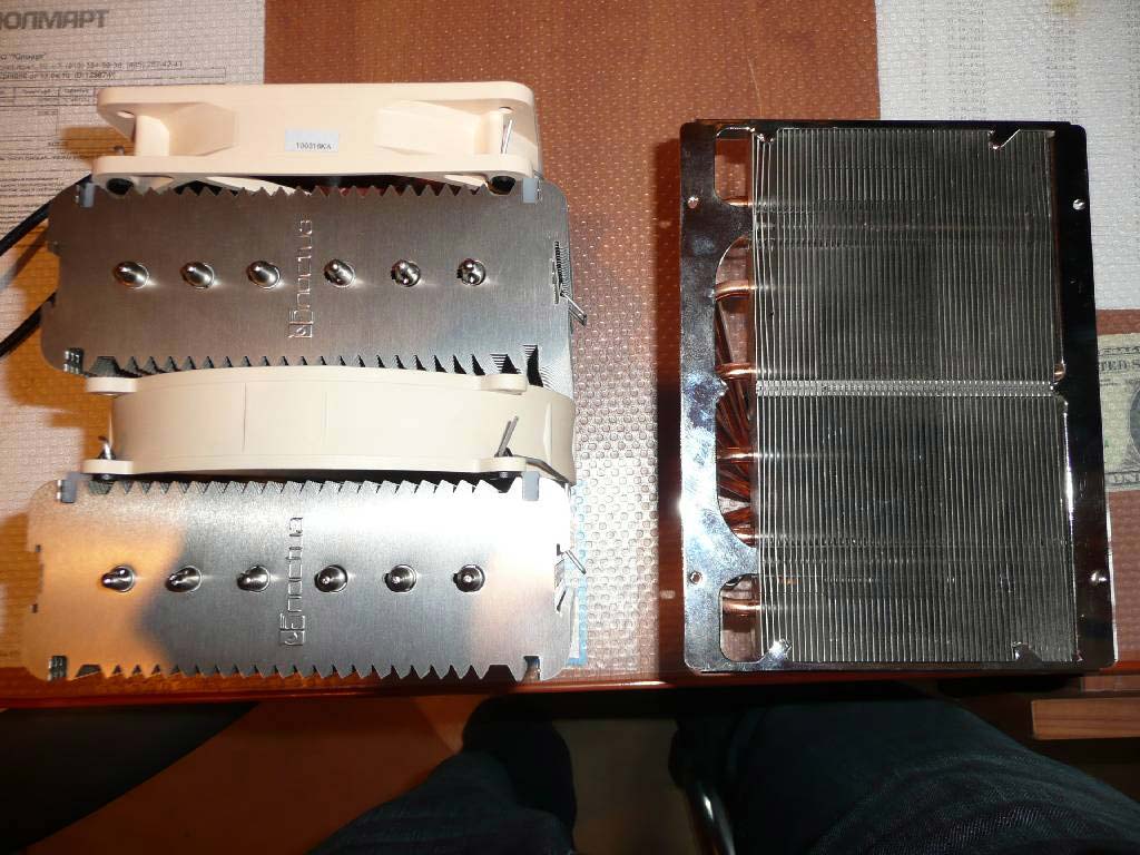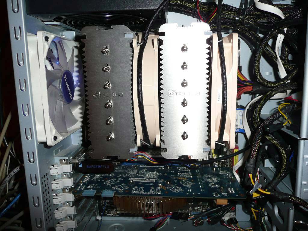Визуально, размеры NH-D14 оказались не такими уж и монструозными как пугали в обзорах, выглядит не намного страшнее чем Cooler Master GeminII с установленными 2*120 вентиляторами.