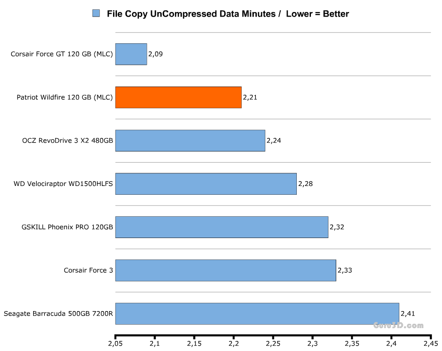 Данный тестовый пакет использует иную, отличающуюся от других систему проведения замеров производительности. Скорее всего, в виду этого авторы с Гуру3Д никогда не получали при тестировании результаты, равные заявленным скоростям. Такова природа теста. Очень странно, но WildFire проиграл тому же Agility 3, причём довольно сильно.