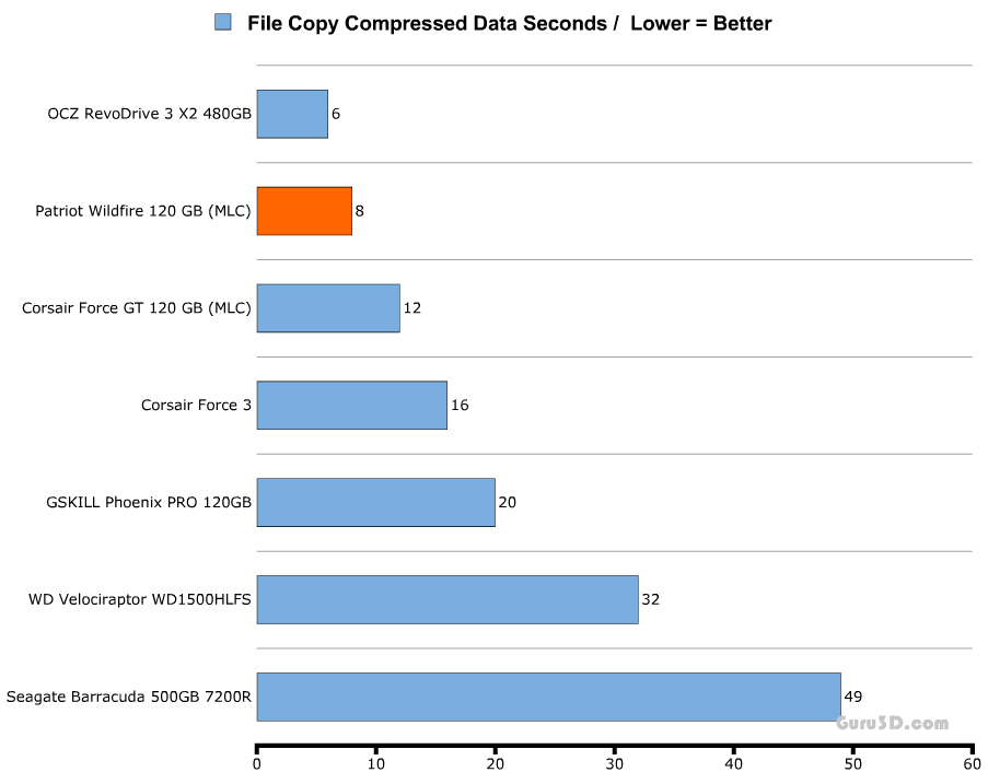 Данный тест (с компрессируемыми файлами) можно назвать неудачным, ибо ботлнеком выступила файловая система, потому показатели у участников тестирования, включая даже механический винчестер от Seagate, столь похожи. На мой взгляд Гилберту стоило для теста использовать не 113586 файлов (да, так много) на 500МБ, а один большой документ на 500МБ или несколько, с тем же самым общим весом.