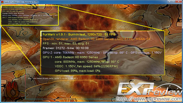 После 10 минут прожарки видяхи в FurMark, её температура достигла 88°, а вентиляторы раскрутились до 2300 об/мин (84% скорости). Шум был такой, что колонки, работающие на средней громкости, вряд ли смогли бы его заглушить. Напряжение на ядре карты было, как видно, 1.150V, а частота ядра скакала от 706МГц до 800МГц.