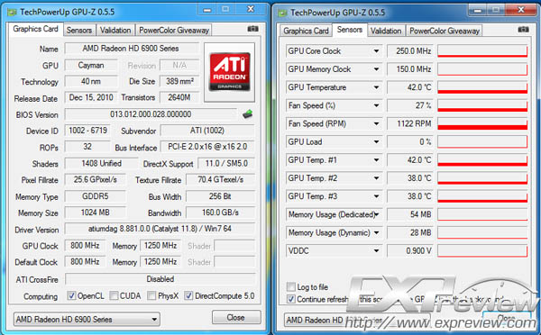 Как хорошо видно по правому скриншоту, в простое карточка работает при напряжении 0.900V и частотах 250/150МГц (ядро/память). После работы в таком состоянии в течении пяти минут, температура стабилизировалась на 42 градусах по Цельсию; кулер работал на 27% своей скорости (1100 оборотов в минуту), по мнению автора оригинального материала, его почти не было слышно.
