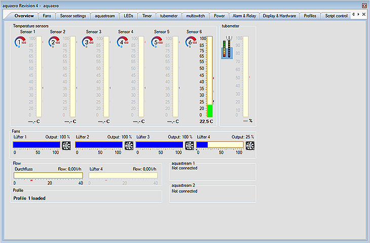 Итак, преступим. ПО называется AquaSuite, а последняя доступная версия была 4.69.00, именно она и использовалась в ходе тестов. Стоит отметить, что Aquasuite – это скорее даже оболочка для целого ряда продуктов Aquacomputer, в которой запускаются приложения для разных устройств, а переключаться между ними можно как между вкладками в браузере. Т.е. мониторинг по абсолютно всему сосредоточен в одном месте. Но вернемся к Aquaero: