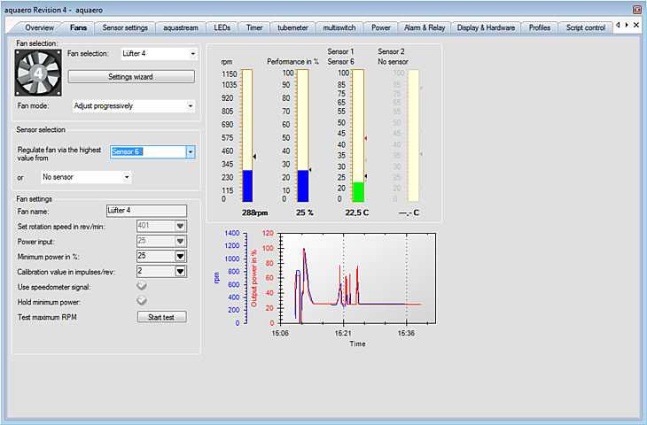 Test maximum RPM – устройство позволяет протестировать вентилятор на максимальные обороты, чтобы принять полученное значение за 100%. Впрочем, при старте системы происходит автоматические тоже самое, а данная возможность предусмотрена в том случае, если вентилятор подключается к уже работающему Aquaero.