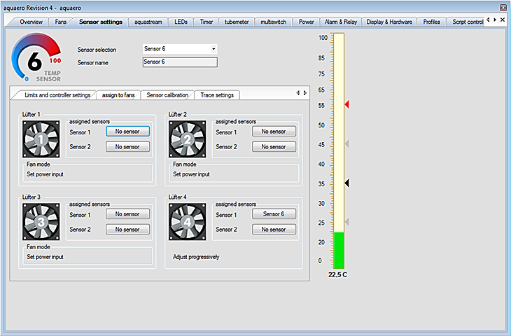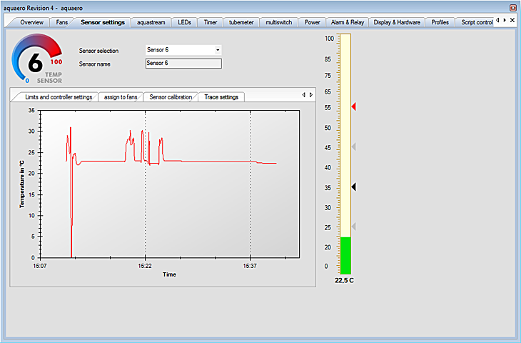 Справа вверху разместились 4 шкалы, первая из которых отвечает за индикацию оборотов вентилятора, вторая – напряжение, а оставшиеся две показывают температуру. Можно заметить черный треугольник рядом со шкалой – маркер. В случае со скоростью вращения и напряжением он указывает на целевое значение, т.е. к чему сейчас стремится Aquaero. Например, на скриншоте выше текущие обороты 288 об/мин, а целевые – около 410 об/мин. Через мгновение маркер на шкале напряжения поднимется выше, а еще через мгновенье и поднимается и напряжение.