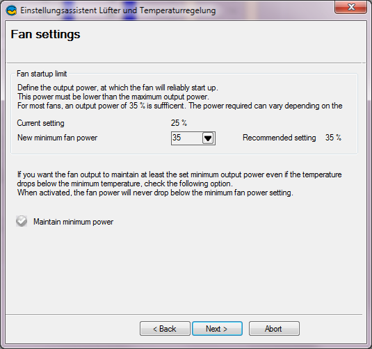 Minimum power – в случае автоматической регулировки можно задать минимальное напряжение. Например, на котором вентилятор продолжает устойчиво работать, чтобы исключить возможность остановки.
