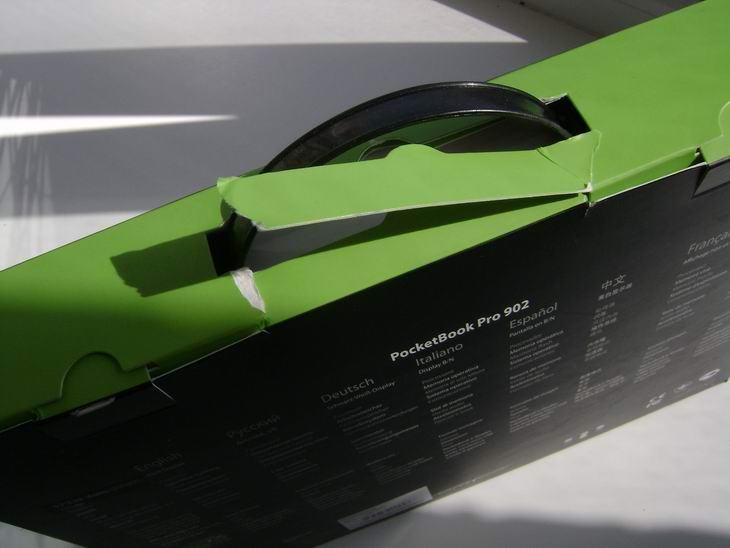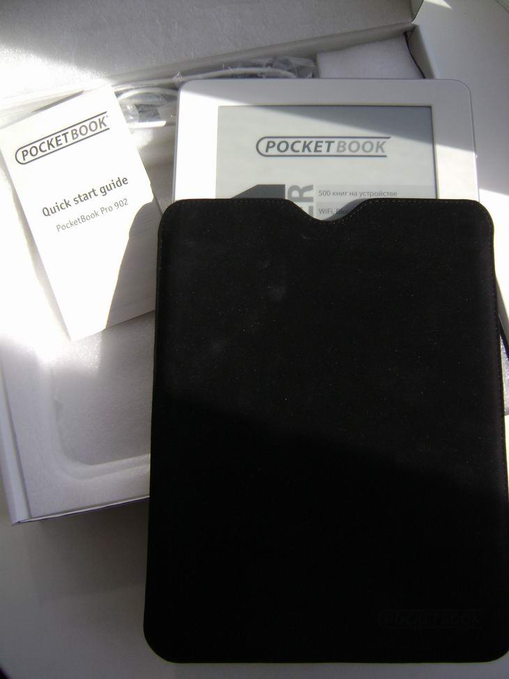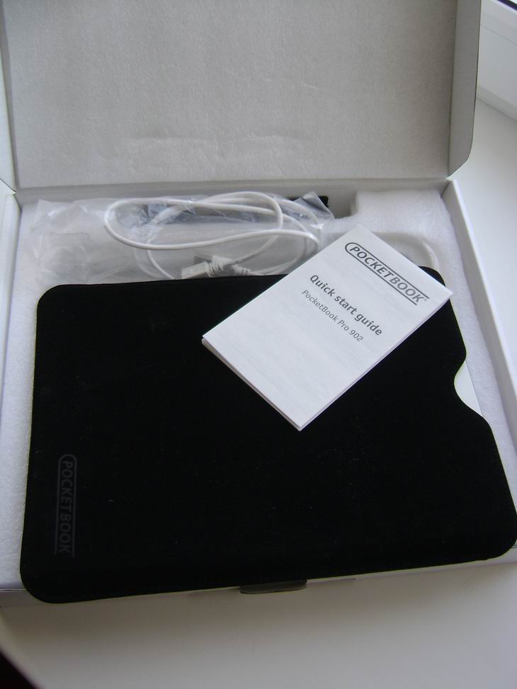 Комплект поставки PocketBook PRO 902: само устройство, находящееся в довольно надёжном на вид чёрно-зелёном футляре, кабель micro-USB, инструкция по эксплуатации. Также там должен быть гарантийный талон, но для тестового оборудования он не полагается ![]()