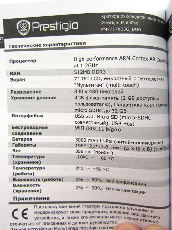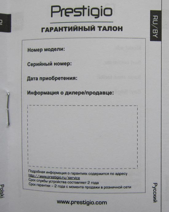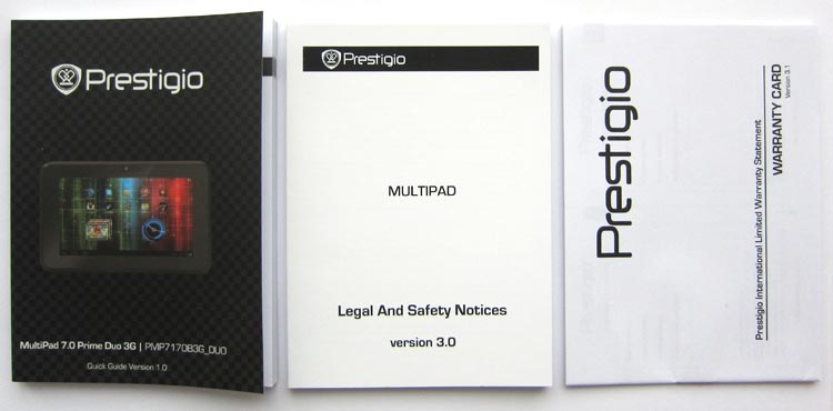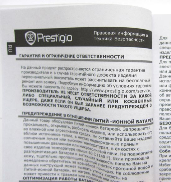 Prestigio не могла не снабдить своё творение полезной макулатурой, в числе которой имеется инструкция, гарантийная карта и документ по безопасности и некоторым правовым вопросам: