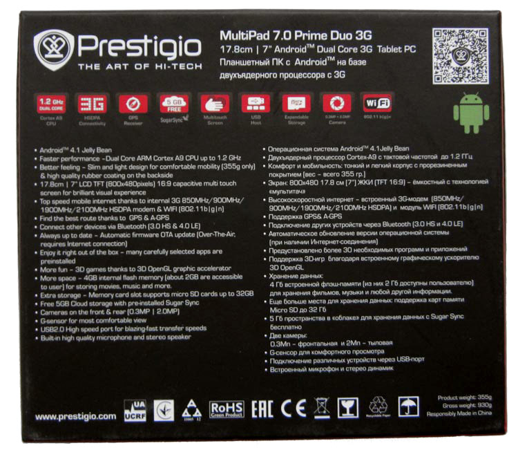 Также, там сказано, что аппарат работает с USB устройствами, имеет слот для карточек памяти (microSD/SDHC), обладает 2МП тыловой и 0.3МП фронтальной камерами, поддерживает 802.11 b/g/n WiFi. В Prestigio подумали, что не лишним будет упомянуть о даруемых 5ГБ свободного места на SugarSync, облачном хранилище данных.