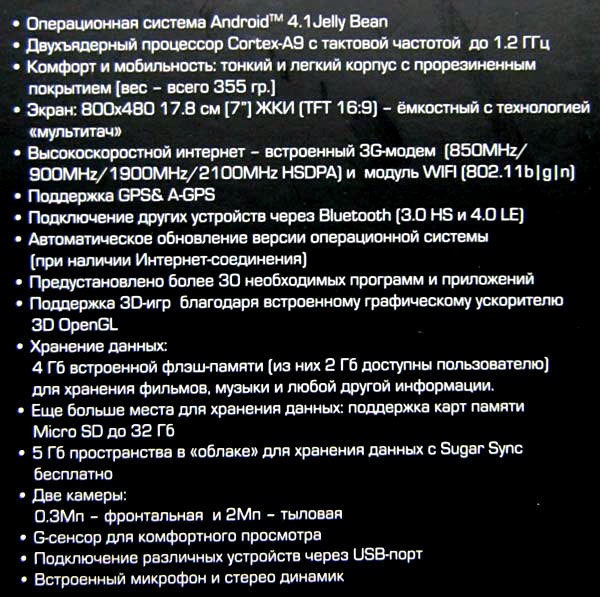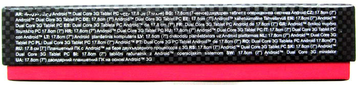 Изделие упаковано качественно, коробка сделана из плотного картона, на ней применена более чем адекватная полиграфия. С фронта коробки можно узнать о том, что в изделии используется двухъядерная SoC на базе ядер Cortex-A9, есть поддержка 3G (HSDPA), имеется GPS ресивер, а экран планшета поддерживает Multi-touch.
