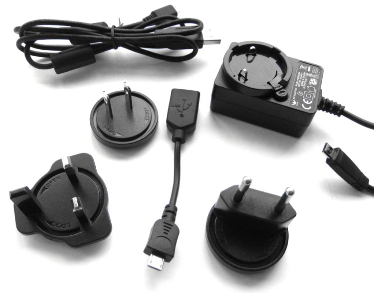 В комплекте с аппаратом пользователь найдёт USB>Micro USB кабель для подключения планшета к ПК или ноутбуку, USB OTG кабель с помощью которого можно подсоединить к продукту Prestigio какое-нибудь устройство - картридер, клавиатуру или флешку (я расскажу о последнем варианте подробнее несколько позже), а также модульный адаптер питания, совместимый с электрическими розетками разных стран. У него одна основа для всех, но разные вилки, которые на ней (на основе) удобно и надёжно крепятся, уже собранный вариант для российских электросетей выглядит следующим образом:
