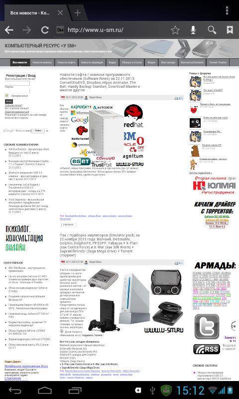 И в горизонтальной и в вертикальной ориентации ресурс выглядит приемлемо, однако из-за низкого разрешения экрана (800x480), мне пришлось в настройках браузера уменьшить масштаб.